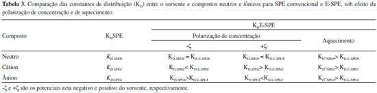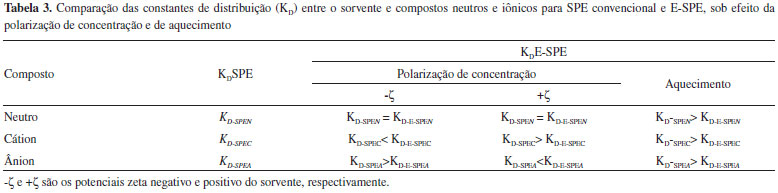Um dos grandes desafios da SPE convencional continua sendo obter e empregar materiais sorventes nos quais os mais diferentes analitos tenham afinidade adequada, sem que haja coextração expressiva de interferentes (Figura 6). Na SPE nem sempre a otimização das condições (solvente, pH e força iônica) das amostras e das soluções de limpeza e de eluição final permite obter um extrato suficientemente livre de interferentes e sem perdas significativas dos analitos (Figura 6). Uma das frentes de desenvolvimento mais recente da SPE consiste na utilização de campo elétrico para que mecanismos eletroforéticos e cromatográficos possam simultaneamente proporcionar uma melhor seletividade e eficiência de extração. Esse procedimento de extração em fase sólida assistida por campo elétrico, também chamada de eletroextração em fase sólida, foi batizado pela sigla E-SPE por Orlando et al.110-112 Na E-SPE dois eletrodos são posicionados ao longo do cartucho de extração, sendo um acima e outro abaixo dos filtros que suportam o sorvente. Uma diferença de potencial elétrico é aplicada durante uma ou mais etapas (aplicação da amostra, limpeza ou eluição final) da extração, formando um campo elétrico ao longo do sorvente, de maneira que os efeitos eletroforéticos possam auxiliar no processo de extração. Os principais efeitos eletroforéticos provenientes da aplicação do campo elétrico em E-SPE são: 1) a migração eletroforética; 2) a eletrosmose; 3) o aquecimento (efeito Joule) e 4) a polarização de concentração (Figura 7). Nos procedimentos de E-SPE os efeitos eletroforéticos são os mesmos descritos para as técnicas de separação por eletroforese (em gel e capilar) e podem ser divididos em efeitos seletivos e não seletivos para a extração.113 Os efeitos eletroforéticos seletivos são a migração eletroforética (representada pela velocidade eletroforética, νep) e a polarização de concentração, pois dependem da carga do analito ou dos interferentes.113,114 A νep é um componente de movimento que pode ser explorada para promover a migração seletiva dos analitos e/ou dos interferentes carregados em contra ou pró-fluxo em relação ao movimento de convecção promovido pela diferença de pressão aplicada (Figura 7). Já a polarização de concentração é a expansão da dupla camada elétrica sobreposta no interior dos poros do sorvente que leva a um maior adensamento de contra-íons (íons de carga oposta ao potencial zeta desenvolvido na superfície do sorvente).114 No exemplo da sílica, na qual os grupos silanóis dissociados geram um potencial zeta negativo (-ζ), a polarização da concentração faz com que haja uma maior concentração de cátions no interior dos poros em relação a região externa da partícula de sorvente.114 Neste caso, como consequência, os cátions apresentam uma afinidade e sorção aparente maior pelo sorvente durante a aplicação do campo elétrico (Tabela 3). Para compostos neutros, tanto a νep como a polarização de concentração não apresentam efeitos apreciáveis (Figura 7, Tabela 3). Dois efeitos eletroforéticos não seletivos também contribuem para o procedimento de E-SPE, a eletrosmose (representada pela velocidade do fluxo eletrosmótico, νeo) e o aquecimento proveniente do efeito Joule. Esses efeitos podem ser considerados não seletivos, pois independentemente dos compostos (analitos ou interferentes) serem carregados ou neutros, o movimento e a sorção deles serão influenciados com a mesma intensidade pela νeo e pelo aquecimento (Figura 7, Tabela 3). Apesar do νeo não depender em geral da carga dos analitos ou dos interferentes, este parâmetro é fortemente dependentes de diversas características do sorvente e do ambiente químico da fase líquida, como potencial zeta, área superficial, porosidade, pH, constante dielétrica, entre outros.113 Já o efeito Joule depende do potencial aplicado, da corrente elétrica resultante e da vazão das soluções. Com o aquecimento durante a aplicação do campo elétrico a afinidade dos compostos pelo sorvente geralmente diminui, o que pode ser traduzido pela diminuição da constante de distribuição do analito pelo sorvente (KD) (Tabela 3).115