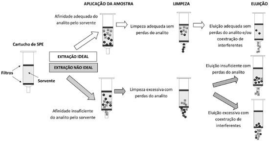 Figura 6. Esquema comparando uma extração ideal por SPE e uma extração real, em que a remoção de interferentes é insuficiente e/ou ocorre perdas do analito durante uma ou mais etapas. Círculos pretos e quadrados brancos representam interferentes e analitos, respectivamente