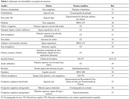 A eletrodiálise é considerada a técnica precursora de preparo de amostras assistida por campo elétrico, uma vez que em 1938 Joseph e Stadie13 reportaram o emprego da eletrodiálise para extração de cloreto e determinação de alcalinidade de soro sanguíneo. Desde então, como mostra a Tabela 1, a eletrodiálise vem sendo empregada tanto na limpeza de amostras (clean up)18-22 como na extração seletiva e pré-concentração de analitos, os quais são determinados principalmente por técnicas de separação, tais como cromatografia18,21,23-30 e eletroforese capilar.20,31-33 A capacidade da eletrodiálise em proporcionar fatores de pré-concentração da ordem de 50 vezes foi demonstrada por Buscher et al.20 na determinação de inositol trifosfato por eletroforese capilar. Em algumas configurações de sistemas de eletrodiálise emprega-se uma membrana de separação (geralmente de acetato de celulose), posicionada entre as membranas de troca iônica. Assim, como ocorre com a diálise, a escolha adequada da porosidade da membrana de separação possibilita a exclusão de moléculas com elevada massa molar.24 Desta forma, a eletrodiálise é interessante para extração de analitos a partir de amostras biológicas.13,24,30,33 A eficiência da eletrodiálise é afetada pelo pH e a força iônica das soluções da amostra (doadora) e aceptora, bem como pelo potencial aplicado e o tempo de extração. Portanto, estes parâmetros necessitam ser otimizados para a obtenção de boas taxas de recuperação dos analitos extraídos. Por exemplo, Doan et al.33 obtiveram recuperações entre 96,3 e 110% na extração de cátions inorgânicos em amostras biológicas.