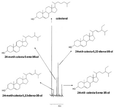 ![]() Figura 1. Perfil cromatográfico dos esteróis da esponja Trochospongilla paulula