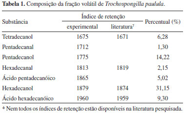 PARTE EXPERIMENTAL Material biológico Espécimes de Trochospongilla paulula (Bowerbank, 1863) foram coletados no município de Santarém, no distrito de Alter do Chao - PA (2º 30,215' S 54º 57,526' O) em 23 de outubro de 2011, com autorizaçao do SISBIO número 30292-1. As espécies foram identificadas por técnicas de microscopia13 e amostras voucher foram depositadas na coleçao de invertebrados do Instituto Nacional de Pesquisas da Amazônia sob o número INPA 0078. Os espécimes foram coletados próximos à linha d'água, e mantidos congelados a - 5 ºC até o momento da extraçao, para análises de voláteis. Para as análises de esteróis foram coletados espécimes secos, na mesma regiao. Obtençao das fraçoes esteroídicas Inicialmente, foram realizadas extraçoes por maceraçao a frio e em extrator tipo Soxhlet por 12 h, ambas com solvente hexano, com as esponjas secas (10,000 g), conforme coletadas na natureza. Nao sendo observadas diferenças no perfil cromatográfico dos extratos obtidos, as extraçoes subsequentes foram realizadas em aparelho tipo Soxhlet. O extrato em hexano foi submetido à cromatografia com sílica impregnada com KOH com o intuito de se obter uma fraçao livre dos ácidos graxos presentes no extrato. A fraçao nao ácida obtida foi entao submetida à cromatografia de coluna aberta utilizando misturas de hexano e acetato de etila como eluentes, em gradiente crescente de polaridade. As fraçoes foram analisadas por cromatografia em camada delgada, reunidas, e as que apresentavam fator de retençao similar ao do colesterol foram submetidas à cromatografia flash e as fraçoes obtidas, ricas em esteróis, foram acetiladas e analisadas por cromatografia em fase gasosa com detector de ionizaçao por chama (CG-DIC) e cromatografia em fase gasosa acoplada a espectrometria de massas (CG-EM). As acetilaçoes foram realizadas com anidrido acético, utilizando dimetilaminopiridina (DMAP) como catalizador. Tempos de retençao relativos ao colesterol (TRR) foram calculados para auxiliar na identificaçao dos esteróis, utilizando um padrao de colesterol. Extraçao da fraçao volátil A extraçao foi realizada por extraçao e destilaçao simultâneas (SDE) em aparelho Likens-Nickerson.14 A esponja congelada foi submetida por 3 horas à extraçao e destilaçao simultânea contínua e a fraçao volátil, obtida em clorofórmio, foi seca com Na2SO4 anidro e armazenada em freezer até a análise em CG-DIC e CG-EM.5 Análises por cromatografia em fase gasosa As análises foram realizadas em cromatógrafo em fase gasosa da Shimadzu® modelo CG2010, equipado com detector de ionizaçao por chama (CG-DIC) e coluna DB-5, com medidas de 15 m × 0,25 mm × 0,25 µm, sendo utilizado como gás de arraste hélio em fluxo de 1 mL min-1, e cromatógrafo em fase gasosa da Shimadzu® modelo QP-2010, acoplado a um espectrômetro de massas (CG-EM) com coluna similar, empregando a técnica de impacto eletrônico a 70 eV. Para a identificaçao dos esteróis a temperatura da coluna foi programada para iniciar a 100 ºC, com acréscimo de 5 ºC min-1 até 290 ºC, permanecendo em 290 ºC por 10 minutos e as injeçoes foram realizadas no modo split 1:20. A análise dos esteróis acetilados foi realizada empregando uma isoterma a 280 ºC por 60 minutos e as injeçoes foram realizadas no modo split 1:20. Um padrao de colesterol acetilado foi utilizado para o cálculo do tempo de retençao relativo. Para a fraçao volátil da esponja a temperatura da coluna foi programada para iniciar a 60 ºC e subir 3 ºC min-1 até atingir 240 ºC, e a injeçao foi realizada no modo splitless. Padroes de hidrocarbonetos lineares foram injetados nas mesmas condiçoes para a obtençao dos índices de retençao linear. A identificaçao foi realizada pelo conjunto de espectros de massas, comparados com espectrotecas, tempos de retençao, índices de retençao e fragmentografia de massas, para identificaçao das séries homólogas.