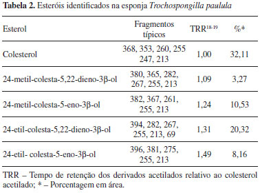 Para a esponja T. paulula, o 24-etil-colesta-5,22-dieno-3β-ol aparece como segundo mais abundante esterol, representando 20,32% do extrato obtido em hexano (Figura 1). Outros três esteróis encontrados aparecem em concentraçoes relativamente elevadas: 24-metil-colesta-5,22-dieno-3β-ol (3,27%), 24-metil-colesta-5-eno-3β-ol (10,53%) e 24-etil-colesta-5-eno-3β-ol (8,16%). Isso evidencia a diferença no perfil aqui observado para os esteróis de T. paulula do relatado para as espécies da família Spongilidae: Ephydatia fluviatilis e Spongilla lacustres. Nessas, foram identificados 12 e 10 esteróis, respectivamente. No entanto, o colesterol representou mais de 65% dos extratos esteroidais.24 O perfil aqui relatado assemelha-se ao relatado para as espécies da família Metaniidae.26 Os esteróis aqui descritos para T. paulula também sao relatados como minoritários em espécies da família Lubormiiskidae que também apresentam o colesterol como majoritário.11