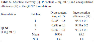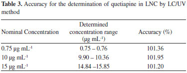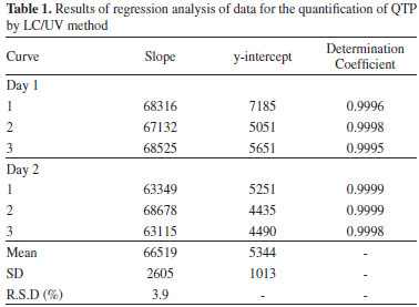 The chromatograms obtained by LC/UV for blank LNC showed a low signal response for the solvent and did not show any peak with similar retention time to QTP (4.3 min ± 5%) allowing to conclude that the developed method is selective in relation to the excipients of the final QLNC formulation. Method validation Linearity of the standard curves was checked in six different runs by the calculation of slopes, intercepts and determination coefficient of each individual curve after plotting the peak area versus nominal concentration. The method showed good linearity in the 0.5 - 20 µg mL-1 range. The representative linear equation was: y = 66519.17x - 5343.8 with a determination coefficient (r2 = 0.999) highly significant for the method (Table 1).