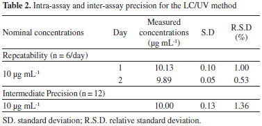 The linearity results were analyzed for statistical significance by ANOVA, using the software GraphPad Prism 5.01. A linear regression (Fcalc > Fcrit; p > 0.05) with no deviation from linearity (Fcalc < Fcrit; p < 0.05) was observed. Repeatability (intra-day) and intermediate precision (inter-day) of the method are reported in Table 2.