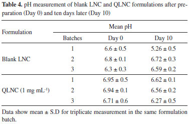 The results of the stability tests showed that QTP standard solution was stable at room temperature for 6 hours, maintaining 104.11 ± 0.19% (lower CQ) and 102.06 ± 3.80% (higher CQ) of the initial concentration and for 1 month in at the -80 ± 1 ºC freezer (lower CQ: 99.31 ± 0.19% and higher CQ: 100.20 ± 1.43%). A literature review showed that previous methods described QTP quantification using liquid chromatography in tandem with mass spectrometry, using high percentage of organic solvent or long running time (~ 9.0 min).13,14,17 The present method is simple, economical (the mobile phase is 70% water) and rapid (QTP retention time: 4.3 min) and was successfully applied for quantification of QTP associated with nanoparticles. QLNC pH measurements and logD determination In order to determine the pH of the QLNC, three different batches were prepared. The QLNC were physicochemically characterized presenting nanometric size (D4.3 = 172 ± 5 nm), negative zeta potential (-9.15 ± 0.9 mV) and low polydispersity index (PI < 0.1). Blank nanocapsules showed similar results in the physicochemical characterization (data not shown) The pH was measured in triplicate, just after the preparation of the LNC (Day 0) and ten days after (Day 10), using a calibrated pHmeter. The results are presented in Table 4.