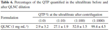 The method of sample extraction and analysis proved to be efficient for absolute recovery analysis, the average-absolute recovery (QTP content) was 0.976 ± 1.4 mg mL-1, which is considered very efficient. The method was also capable of determining free QTP present in the ultrafitrate samples. The encapsulation efficiency (IE%) describes the efficiency of the QTP loading process into the QLNC. After centrifugation, the ultrafiltrate could be directly analyzed by the LC/UV method developed, without any sample preparation steps. The high IE observed (95.5%) is due to QTP lipophilicity at the formulation pH which increases the dispersion of the drug in the lipid core of the nanocapsules. QTP saturation concentrations in water and polysorbate 80 aqueous solution The saturation concentration of QTP in pure water was 4.1 ± 0.6 x 10-2 mg mL-1, slightly lower than in the P-80 solution, 5.5 ± 0.3 x 10-2 mg mL-1. These results demonstrate that free drug is soluble in LNC aqueous medium of nanoparticles dispersion and that QTP concentration in the ultrafiltrate is below its saturation concentration does not allowing for the formation of insolubles crystals. Furthermore, the drug is very soluble in the oil of the nanoparticles core (> 1 mg mL-1). After LNC dilution with pure water, viewing to determine the type of drug distribution in the nanoparticles, QTP concentration in the aqueous media is even lower that the saturation concentration and no nanocrystal could be formed. Application of the algorithm to experimentally determine QTP distribution QLNC formulation We applied an algorithm proposed by Oliveira et al.7 in order to determine the distribution of quetiapine in the pseudo-phases of the nanoparticles. The algorithm is composed of six questions and the rational basis of it is the use of serial dilutions and centrifugations in order to shift the drug distribution equilibrium allowing the quantification of the drug distribution among the different pseudo-phases of the formulation. The results obtained for the dilution in QLNC are shown in Table 6.