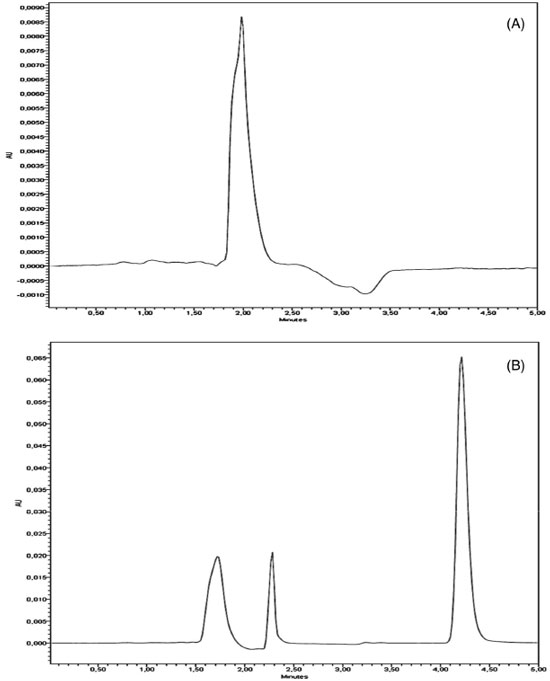 RESULTS AND DISCUSSION LC/UV method development Before the validation step, the chromatographic conditions were optimized for the determination of QTP in order to provide a good performance analysis within a suitable analysis time (5 min), peak parameters (symmetry, tailing), ease of preparation and low cost. The mobile phase consisting a mixture of triethylamine aqueous solution (0.4%, v/v) adjusted to pH 3.0 ± 0.2 using phosphoric acid and acetonitrile (70:30,v/v), using isocratic mode with mobile phase flow rate at 1.0 mL.min-1 was found to be satisfactory allowing a rapid determination of the drug, which is important for routine analysis. The use of a C18 column was suitable for separation of QTP and resulted in adequate peak shape and resolution. Based on QTP UV spectra (data not shown) the wavelength for UV analysis was chosen allowing the maximum absorption for the drug detection. The specificity of the analytical method is illustrated in Figure 2 by comparing the chromatograms of blank extracted LNC (Figure 2-A) and QTP extracted from QLNC formulation (10 µg mL-1) (Figure 2-B).