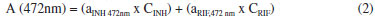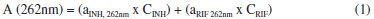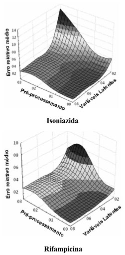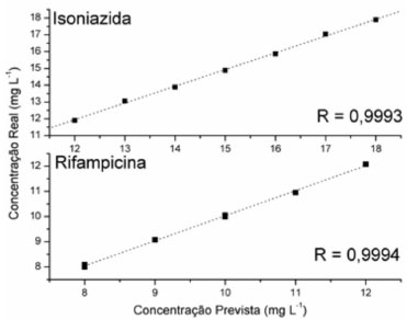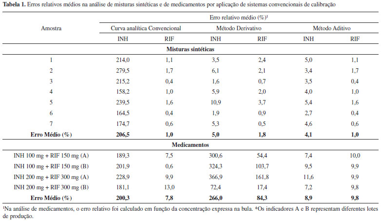 Inicialmente, curvas analíticas convencionais foram elaboradas para cada fármaco, obtendo-se coeficientes de regressao (INH em 262 nm: 0,999, RIF em 472 nm: 0,998) superiores ao mínimo exigido pela ANVISA (rmin: 0,99). Na análise das 7 misturas sintéticas reservadas para validaçao o método proporcionou erros médios de previsao da ordem de 200% para INH, por conta da forte interferência espectral ocasionada pela RIF. Para rifampicina a situaçao é completamente diferente, em razao da inexistência de efeitos interferentes por parte do segundo fármaco. Nestas condiçoes, o erro médio de previsao é da ordem de 1% (Tabela 1).