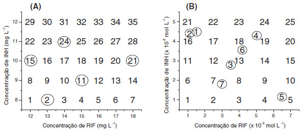 MATERIAIS E MÉTODOS Reagentes e medicamentos Padroes de isoniazida (INH: 100,80%) e rifampicina (RIF: 99.70%) foram gentilmente fornecidos pelo Laboratório Farmacêutico Far-Manguinhos, da Fundaçao Oswaldo Cruz. Soluçoes de trabalho foram preparadas diariamente, utilizando-se água deionizada (Milli-Q® - 18,2 MΩ) e vidraria analítica previamente calibrada. Medicamentos contendo a associaçao em estudo (100 mg de INH + 150 mg de RIF e 200 mg de INH + 300 mg de RIF) foram gentilmente fornecidos pela Secretaria de Saúde do Estado do Paraná. Todos os demais reagentes utilizados foram de grau analítico. Equipamentos Espectros UV/Vis em soluçao foram adquiridos em espectrofotômetro Shimadzu (modelo 2410 PC), utilizando-se cubetas de quartzo de 1 cm de caminho ótico. Para fins comparativos, espectros foram também registrados em espectrofotômetro Hewlett Packard (modelo 8452 A). A análise por Cromatografia Líquida de Alta Eficiência foi realizada em um Cromatógrafo Varian 920-LC, equipado com coluna C18 (4,6 mm x 25 cm) e detector de arranjo de fotodiodos (238 nm). Como fase móvel foi utilizado fosfato de sódio dibásico: acetonitrila e sistema de eluiçao por gradiente, conforme método padrao de análise.15 Curvas analíticas individuais foram preparadas a partir de padroes puros, cobrindo-se a faixa de 0,08 a 0,12 mg L-1 para isoniazida (R: 0,997) e de 0,13 a 0,20 mg L-1 para rifampicina (R: 0,995). Programas computacionais Para a montagem de matrizes de dados utilizou-se o software Origin Pro 6.1® (OriginLab), enquanto que para a elaboraçao dos modelos empregou-se o programa PLS-toolbox 3.0 (Eigenvector Research, Inc.), que opera em ambiente Matlab v.6.5 (Math Work Inc.). Os gráficos de superfície de resposta foram construídos no programa Statistic 6.0 (StatSoft inc.). Desenvolvimento de modelos de calibraçao Modelos convencionais Para o desenvolvimento de modelos univariados convencionais foram elaboradas curvas analíticas individuais, no comprimento de onda de máxima absorçao apresentado por cada fármaco (INH: 262 nm, RIF: 472 nm). Cada curva analítica foi composta de 5 valores de concentraçao, cobrindo-se a faixa de 8,0 a 12,0 mg L-1 para isoniazida, e de 12,0 a 18,0 mg L-1 para rifampicina. Modelos univariados foram também elaborados no modo derivativo. Neste caso, curvas analíticas para INH foram elaboradas nos comprimentos de onda em que RIF apresenta uma derivada da absorbância igual à zero (ponto de anulaçao). O mesmo procedimento foi utilizado para a elaboraçao das curvas analíticas de rifampicina. Modelos multivariados sem reaçao colorimétrica com Cu(ll) e neocuproína Modelos multivariados de calibraçao (PLSR) foram desenvolvidos a partir de 28 misturas sintéticas, contendo 8,0 a 12,0 mg L-1 de INH e 12,0 a 18,0 mg L-1 de RIF, enquanto que outras 7 amostras foram reservadas para a fase de validaçao (Figura 1A). Nenhum tipo de planejamento de misturas foi utilizado para estabelecer o conjunto de calibraçao, sendo utilizado como único critério o teor dos fármacos nos medicamentos analisados e a variaçao máxima permitida, que costuma ser de 20%.