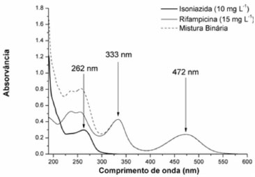 ![]() Figura 2. Espectro eletrônico de soluçoes aquosas de padroes puros de isoniazida, rifampicina e da sua mistura