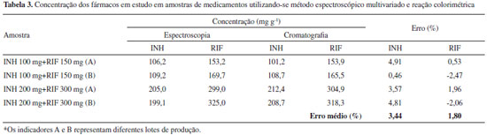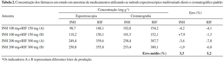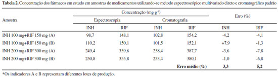 Na análise de medicamentos (Tabela 2), o modelo multivariado proporcionou resultados coerentes com os resultados obtidos por aplicaçao do método cromatográfico padrao, com discrepâncias médias inferiores a 5% para ambos os fármacos.