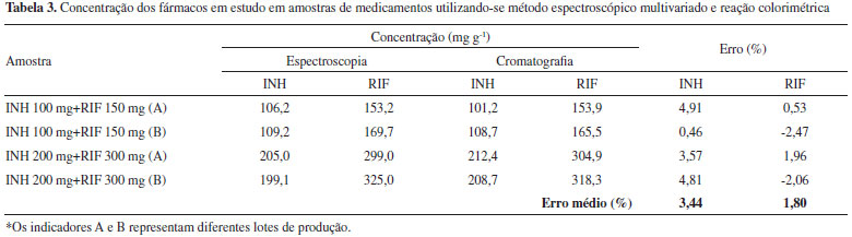 Análise multivariada após reaçao colorimétrica de RIF e INH com Cu(ll) e neocuproína A reaçao colorimétrica química da INH foi fundamentada no seu efeito redutor sobre o complexo Cu(II)-neocuproína, o que leva à formaçao do complexo Cu(I)-neocuproína que absorve intensamente em 449 nm.16 Para elaboraçao do modelo multivariado foi utilizado um conjunto de calibraçao composto por 25 misturas sintéticas e espectros na regiao do visível (350 a 800 nm), pré-processados por alisamento. O modelo de melhor desempenho foi elaborado com 3 VLs, permitindo erros médios de previsao inferiores a 2% na fase de validaçao externa, assim como ausência de erros sistemáticos. Na análise de medicamentos (Tabela 3) foi possível observar erros médios de previsao inferiores a 5%, tomando-se como referência os resultados obtidos pela técnica cromatográfica padrao. Cabe ressaltar que a utilizaçao de reaçao colorimétrica propiciou maior seletividade do método, uma vez que permite a determinaçao dos analitos na regiao visível do espectro ultravioleta, permitindo a aplicaçao com sucesso na determinaçao de RIF e INH em amostras de urina humana conforme relatado em um trabalho anteriormente publicado.16