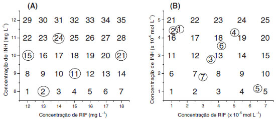 Os espectros foram registrados entre 190 e 600 nm, sendo processados após rotinas de centrar na média (CM), auto-escalamento (AU), alisamento pelo método Savitzky-Golay (SG) e alisamento com derivaçao (SG1ª). O número de variáveis latentes foi selecionado com base na minimizaçao do erro relativo médio na validaçao cruzada (sistema leave-one-out), enquanto que a capacidade de previsao foi avaliada com um conjunto de sete misturas sintéticas, reservadas como conjunto de validaçao externa (amostras circuladas na Figura 1A). Na análise de amostras reais (medicamentos), 20 comprimidos (ou cápsulas) foram triturados e homogeneizadas em almofariz. Massas de aproximadamente 0,06 g foram tomadas e dissolvidas em 1.000,00 mL de água destilada. Desta soluçao foram tomados volumes de 20,00 a 50,00 mL, dependendo da concentraçao dos substratos em estudo, sendo finalmente diluídos até 100,0 mL. Todos os ensaios foram realizados em triplicata. Modelos multivariados com reaçao colorimétrica com Cu(ll) e neocuproína Modelos multivariados de calibraçao (PLSR) foram desenvolvidos a partir de 25 misturas sintéticas, contendo 1,0 a 5,0 mg L-1 de INH e 1,0 a 7,0 mg L-1 de RIF, enquanto que outras 13 amostras, incluindo 3 triplicatas, foram reservadas para a fase de validaçao (Figura 1B). Em todos os ensaios foram adicionados 1000 mL das soluçoes estoque de neocuproína (1,0 x 10-2 mol L-1 em metanol 10%) e Cu(NO3)2.3H2O (1,0x10-2 mol L-1), utilizando-se tampao acetato (pH = 5,00) em todas as diluiçoes.16 Para elaboraçao dos modelos multivariados, os espectros adquiridos na regiao do visível (350 e 800 nm) foram suavizados, utilizando-se o método Savitzky-Golay. A seleçao do número de variáveis latentes foi realizada de acordo com o mesmo critério utilizado na elaboraçao dos modelos descritos no item anterior. Da mesma forma, a capacidade de previsao foi avaliada com um conjunto de sete misturas sintéticas, reservadas como conjunto de validaçao externa (amostras circuladas na Figura 1B). Na análise de amostras reais (medicamentos), 20 comprimidos (ou cápsulas) foram triturados e homogeneizadas em almofariz. Massas de aproximadamente 0,06 g foram tomadas, dissolvidas em 10,00 ml de metanol, completando-se o volume com água até 100,00 mL. A seguir, uma alíquota de 1000 µL foi transferida para balao volumétrico de 10,00 mL, adicionando-se 1000 µL de soluçao de nitrato cúprico (1,0 x 10-2 mol L-1) e 1000 µL de soluçao de neocuproina (1,0 x 10-2 mol L-1) e completando-se o volume com tampao acetato de sódio/ácido acético (pH 5,00). Validaçao de metodologias multivariadas Ambos os modelos multivariados foram validados de acordo com os critérios estabelecidos pela ANVISA,17 avaliando parâmetros de exatidao, precisao (repetibilidade e reprodutibilidade) e robustez (tempo de leitura, temperatura e pH). A precisao foi avaliada por análise em triplicata de três misturas sintéticas, contendo concentraçao baixa, média e alta. A repetibilidade foi avaliada por análises efetuadas pelo mesmo operador, no mesmo dia e utilizando-se o mesmo equipamento, enquanto que a reprodutibilidade envolveu a participaçao de um segundo analista e a utilizaçao de um equipamento diferente (espectrofotômetro HP 8452-A). A precisao foi expressa na forma de desvio padrao relativo, considerando-se aceitos valores inferiores a 5%. A exatidao foi avaliada por meio de ensaios de recuperaçao, utilizando-se as mesmas misturas sintéticas utilizadas na avaliaçao da precisao. A exatidao foi expressa na forma de erro percentual, considerando-se aceitos valores de recuperaçao entre 95 e 105%. A avaliaçao da robustez envolveu estudos orientados a verificar o efeito do tempo de leitura, da temperatura e do pH. Estes estudos foram realizados com apenas uma mistura sintética, contendo 10,00 mg L-1 de INH e 15,00 mg L-1 de RIF.