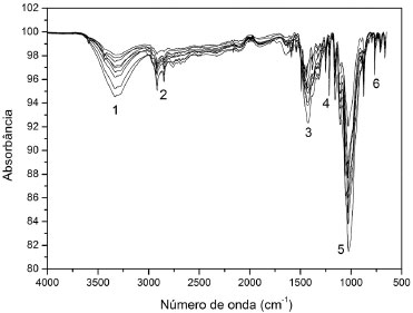 ![]() Figura 4. Espectros de ATR-FTIR sobrepostos para as amostras S1-S8 e S13