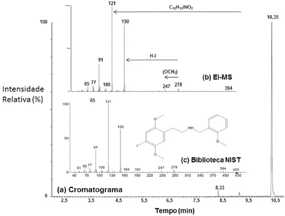 CG-EM O cromatograma de uma solução contendo o princípio ativo 25I-NBOMe (amostra S14) é mostrado na Figura 5a. O tempo de retenção em 10,35 minutos corresponde ao composto 25I-NBOMe e seu espectro de EI-MS é mostrado na Figura 5b. Uma boa correlação é observada com a biblioteca do National Institute of Standards and Technology (NIST), Figura 5c, sendo algumas perdas identificadas como HI, OCH3 e C10H13INO2. Vale destacar que a molécula de 25I-NBOMe não tem o seu íon molecular detectado. Isso é devido a sua alta massa molar e labilidade química, podendo esse problema ser contornado por meio da diminuição da energia da fonte de EI (< 70 eV) ou pelo método de ionização química (CI). A não detecção do íon molecular do composto 25I-NBOMe têm produzidos resultados inconclusivos para diferenciação entre os compostos NBOMes, onde os espectros de EI-MS gerados são bastante similares.