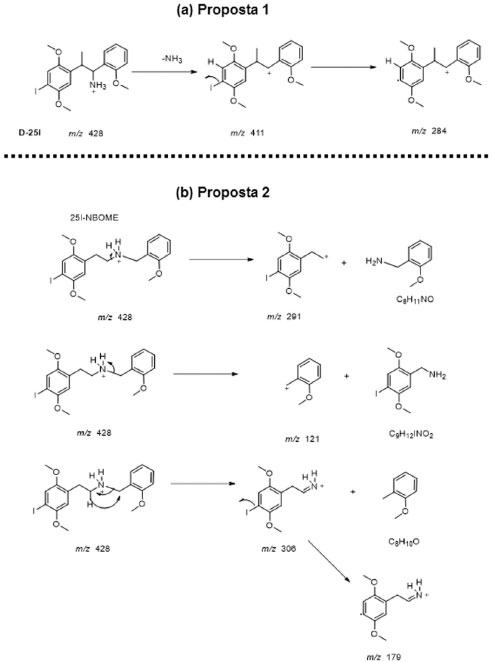 ![]() Figura 7. Propostas de fragmentação sugeridas para o espectro de ESI(+)-MS/MS (Figura 6c). A proposta 1 (7a) explica a formação dos fragmentos de m/z 411 e 284, corroborando com a presença de um isômero do 25I-NBOMe contendo uma amina primária. A proposta 2 (7b) explica a maioria dos fragmentos presentes corroborando com a estrutura e conectividade da molécula de 25I-NBOMe