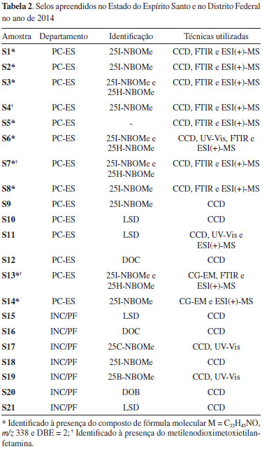 PROCEDIMENTO EXPERIMENTAL Amostras e reagentes Quatorze amostras de selos (nomeadas de S1 a S14) foram fornecidas pelo Laboratório de Química Legal da Superintendência da PC-ES e sete soluções de extratos metanólicos de selos (S15-S21) foram fornecidas pelo Instituto Nacional de Criminalística da Polícia Federal de Brasília. A Tabela 2 mostra a relação dos selos apreendidos e os princípios ativos previamente identificados, além das técnicas empregadas para cada amostra. A Figura 1S (material suplementar) mostra a foto de alguns selos apreendidos no ano de 2014 pelo Laboratório de Química Legal da PC-ES. Solventes como acetonitrila, hexano, dietilamina e tolueno (todos grau UV/HPLC, 99,5%, Vetec® Química Fina Ltda, Rio de Janeiro) foram usados para as análises de espectroscopia na região do UV-Vis e CCD. O solvente metanol e os reagentes trifluoroacetato de sódio (NaTFA) e L-arginina (Sigma-Aldrich Chemicals, EUA) foram usados para a dissolução de amostra, calibração e análise por ESI(+)FT-ICR MS.
