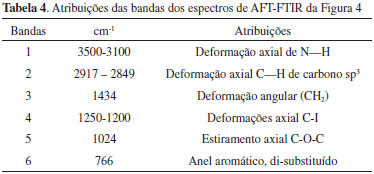 A banda na forma de dupleto na região de 3600-3200 cm-1 (banda 1) corresponde à deformação axial N-H do grupo amina. Já as bandas nas regiões de 2917-2849 cm-1 (banda 2) e de 1434 cm-1 (banda 3) correspondem à deformação axial C-H de carbono sp3 (grupos CH3 e CH2) e deformação angular simétrica no plano de CH2, respectivamente. A identificação do grupo éter é feita a partir da deformação axial intensa C-O-C em 1024 cm-1 (banda 5). O anel aromático é identificado a partir da deformação angular fora do plano de C-H em 766 cm-1 (banda 6) que é característica de anel aromático di-substituído. Por fim, a presença do iodo pode ser caracterizada pela deformação axial C-I na região de 1205 cm-1 (banda 4). Outra banda característica dessa deformação é encontrada na região de 600-500 cm-1. Entretanto, todos os experimentos foram feitos na região de 4000 cm-1 a 650 cm-1. Como sugerido pelos dados de CCD e ESI(+)-FT-ICR MS, Figuras 2 e 6, a amostra S5 não apresenta o princípio ativo 25I-NBOMe. Analisando o espectro de ATR-FTIR isoladamente, Figura 2S, nota-se principalmente a ausência de deformações de 1205 e 766 cm-1, o que elimina a presença do composto 25I-NBOMe. Além disso, devido à falta de material de referência e a presença de inúmeros contaminantes em amostras sintéticas, é essencial que para uma análise forense, a técnica de ATR-FTIR seja combinada a métodos multivariados de classificação, fornecendo, assim, evidências inquestionáveis no que tange a detecção de novas designer drugs.