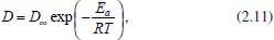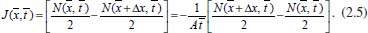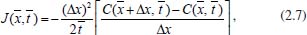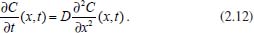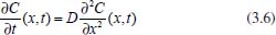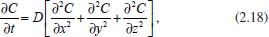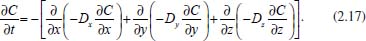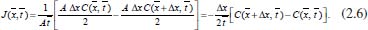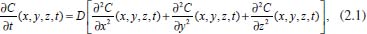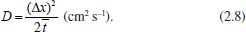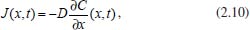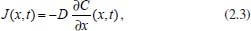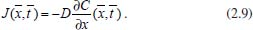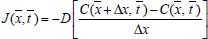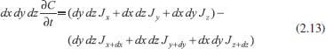 A 1ª lei de Fick estabelece que o fluxo de uma espécie, ou a quantidade de matéria que se difunde, por unidade de tempo, na direção perpendicular a uma região planar de área A, é proporcional ao gradiente de concentração da espécie. Matematicamente isso é descrito por ![]() em que C(x,t) representa a concentração da espécie no ponto x e no instante t, D é o coeficiente de difusão ou difusividade e o sinal negativo indica que o fluxo ocorre sempre na direção de maior para menor concentração. É importante observar que a 1ª lei de Fick é aplicada a sistemas: estacionários,4 ou seja, quando não ocorre variação da concentração com o tempo; em estados transientes para descrever o fluxo em um instante de tempo em uma determinada posição; como uma condição de contorno na resolução da 2ª lei de Fick ou mesmo na explicação para se obter a 2ª lei. Assim, será utilizado o símbolo Como a maioria das leis físicas, esta também foi proposta a partir de observações empíricas, e para compreender sua dedução teórica apresentaremos aqui uma formulação sucinta, de forma mais intuitiva e sem grande rigor matemático e físico, porém para os leitores que desejarem compreendê-la mais detalhadamente, sugerimos os livros de A. J. Bard e L. R. Faulker10 ou de J. O'M. Bockris e A. K. N. Reddy.3,4 Suponha, sem perda de generalidade, que o fluxo de uma espécie esteja ocorrendo da esquerda para a direita na Figura 1, passando pelo plano em um ponto arbitrário ![]() Portanto, considerando Δx ≈ 0, o fluxo no instante ![]() Em termos de concentração, em que o volume da região considerada é dado por V = AΔx, o fluxo é dado por ![]() Se a variação Δx for muito pequena (Δx → 0)10 tem-se a forma contínua da equação (2.6) e, para a análise matemática. é interessante que se tenha a quantidade Δx no denominador, pois isso levará a uma derivada, facilitando o tratamento matemático. Assim, multiplicando e dividindo o lado direito da expressão (2.6) por Δx e rearranjando os termos adequadamente, obtém-se ![]() em que a concentração é dada em mol cm-3 ou mol m-3. O termo (Δx)2 pode ser interpretado como a média dos quadrados das distâncias percorridas por todas as moléculas presentes neste movimento,4,10 possuindo, portanto, dimensão cm2. Assim, considerando a equação de Einstein-Smoluchowski,3,4 (Δx)2 = 2D ![]() Considerando ainda que as espécies químicas estejam desacopladas (as partículas se movem sem interação significativa entre elas), o coeficiente de autodifusão (parâmetro microscópico) corresponde ao de difusão (parâmetro macroscópico) e, por isso, a equação (2.8) pode ser substituída em (2.7), tendo-se ![]() e, quando Δx → 0, obtém-se ![]() Como ![]() conforme anunciado na 1ª lei de Fick. O coeficiente de difusão D é bastante sensível à variação de temperatura e frequentemente segue uma equação do tipo Arrhenius: ![]() em que Ea kJ mol-1 é a energia de ativação para difusão e D∞ é um valor hipotético de D a uma temperatura infinita T. Uma ilustração prática dessa lei de Fick é seu uso para caracterizar a difusão através de membrana biológica e outras membranas. Para aplicá-la a uma membrana celular de espessura ℓ há que se supor que ℓ seja tão pequeno que predomine a difusão de estado estacionário e que as fases solução em ambos os lados da membrana sejam bem misturadas. Neste caso, ∂C/∂x ~ (Cfora - Cdentro)/ℓ , em que Cfora e Cdentro representam as concentrações fora e dentro da membrana, respectivamente. O fluxo de difusão J é dado por D(Cfora - Cdentro)/ℓ, e D/ℓ é a permeabilidade.11 Como já observado, o desenvolvimento acima é válido apenas para difusão em estado estacionário, porém, a maioria das situações práticas envolvendo difusão ocorre em estado não estacionário, no qual a concentração da espécie varia tanto com a posição em que se encontra, quanto com o tempo. Se for considerada apenas a direção x, estas situações são usualmente representadas pela 2ª lei de Fick que, em coordenadas cartesianas (ou retangulares), é dada pela equação diferencial parcial ![]() A dedução desta equação será feita inicialmente para o caso mais geral, ou seja, a difusão espacial, que ocorre no espaço tridimensional. Como caso particular tem-se a equação (2.12). Considere, portanto, um paralelepípedo como o mostrado na Figura 2 e suponha que a difusão esteja ocorrendo através dele, cujos fluxos ocorram nos sentidos de x para x + dx, de y para y + dy e de z para z + dz, através dos planos yz, xz e xy, respectivamente.