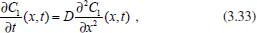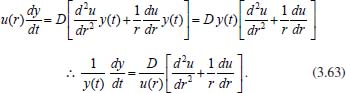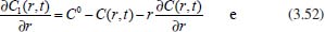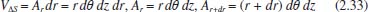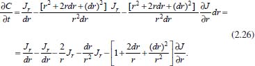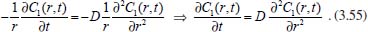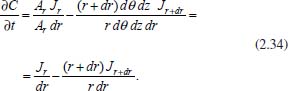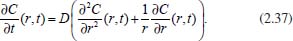 Como a ideia é exatamente a mesma dos casos anteriores, tem-se ![]() em que VΔS é o volume da região da camada cilíndrica, Ar é a área da parte do cilindro de raio r, Ar + dr é a área da parte do cilindro de raio r + dr, Jr é o fluxo passando por Ar e Jr + dr é o fluxo passando por Ar + dr. Como as dimensões dr, dθ e dz são infinitesimais, pode-se tomar valores aproximados para o volume VΔS e para as áreas Ar e Ar + dr, considerando ![]() Logo, da equação (2.32) segue que ![]() Utilizando a expansão de Taylor de primeira ordem para Jr + dr tem-se ![]() Novamente, cancelando os termos semelhantes com sinais opostos, fazendo dr tender a zero (dr → 0), utilizando a 1ª lei de Fick para o fluxo (lembrando que o gradiente agora é dado em termos de coordenadas cilíndricas) e considerando o coeficiente de difusão constante, obtém-se ![]() Portanto, em termos de coordenadas cilíndricas, a equação de difusão radial é dada por ![]()