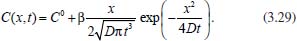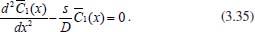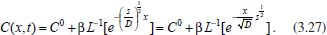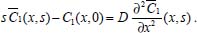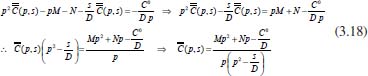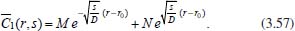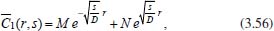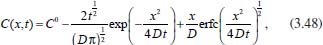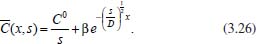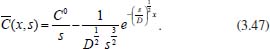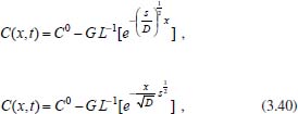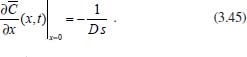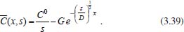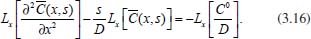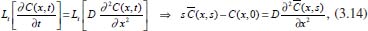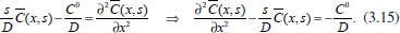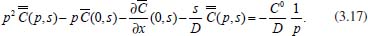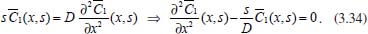 Portanto, se L[f (t)] é a transformada de Laplace de f (t), então, L[f'(t)] = s L[f (t)] - f (0)]. P3 (Transformada da derivada segunda): Se f é uma função contínua e diferenciável até segunda ordem em [0, ∞) tal que a transformada de Laplace de f e de sua derivada existam para todo t neste intervalo, então, a transformada da segunda derivada de f, L[f"(t)], existe e satisfaz ![]() Demonstração: Por definição, L[f"(t)] é dada por ![]() concluindo-se que ![]() P4 (Transformada envolvendo funções de duas variáveis): Se f é uma função contínua nas variáveis x e t, então, a transformada de Laplace de f deve ser calculada parcialmente em relação a cada variável. E as transformadas sucessivas também podem ser calculadas conforme segue: ![]() ![]() Demonstração: Consequência imediata da definição da transformada de Laplace e da integração de funções de várias variáveis.13 P5 (Transformada envolvendo derivadas de funções de duas variáveis): Se f (x, t) é uma função contínua com derivadas parciais contínuas até segunda ordem nas variáveis x e t, e se Lt[f(x,t)] = F(x, s), então ![]() Demonstração: Isso é consequência imediata do fato de que, se f é contínua e possui derivadas parciais contínuas até segunda ordem, então a ordem de integração e de diferenciação de f em relação às variáveis x e t não importa. Assim, pela definição de Lt tem-se ![]() Resolução 1 Retomando o problema de resolver a equação (3.6), dada por ![]() em que ![]() Aplicando a transformada de Laplace em relação à variável x tem-se: ![]() Utilizando as propriedades P3 e P5 e o Exemplo 1 tem-se ![]() Os valores de ![]() Tomando ![]() Separando o último termo em frações parciais2 tem-se: ![]() Logo, ![]() Portanto, considerando iguais os denominadores das frações em (3.20), a igualdade será verdadeira somente se os coeficientes dos termos semelhantes dos polinômios dos numeradores forem iguais, ou seja, se ![]() Da terceira equação obtém-se ![]() É um sistema linear de duas equações e duas incógnitas, cuja solução é facilmente calculada e dada por ![]() Como os valores de M e N não são conhecidos, pois dependem da técnica eletroquímica, os cálculos continuarão sendo feitos com β e γ para fins de simplificação da notação. Assim, ![]() Aplicando a transformada inversa de Laplace para p, que está relacionado com a variável x: ![]() Utilizando uma Tabela ou um software para encontrar as transformadas inversas tem-se: ![]() Observa-se que no caso do software Mathematica®, os comandos para calcular estas transformadas inversas são: InverseLaplaceTransform[1/p, p, x], com retorno: 1 InverseLaplaceTransform[1/(p+z), p, x], com retorno: e-xz InverseLaplaceTransform[1/(p-z), p, x], com retorno: exz Substituindo o valor de ![]() Utilizando a condição de contorno (3.6) pode-se calcular γ, pois ![]() Portanto, calculando o limite da expressão (3.25), quando x → ∞, tem-se ![]() o que ocorre somente quando γ = 0. Logo, ![]() Aplicando a transformada inversa de Laplace para s, que está relacionado com a variável t, tem-se ![]() Esta transformada inversa não aparece com muita frequência nas Tabelas, porém, quando encontrada é usualmente apresentada na forma ![]() Considerando ![]() Utilizando-se o software Mathematica® para calcular esta transformada inversa, o resultado é obtido diretamente fazendo: InverseLaplaceTransform[Exp[-x*Sqrt[s/D]], s, t], cujo retorno é Observa-se que valor de β depende de outra condição de contorno definida pela técnica eletroquímica utilizada. Resolução 2 Outra maneira de resolver o problema apresentado em (3.6) é por meio de uma mudança de variável que possibilita trabalhar com a equação diferencial parcial na forma de uma equação diferencial ordinária linear homogênea de fácil solução. Seja, então, ![]() a mudança que representa uma perturbação produzida na concentração inicial do sistema. Assim, C(x,t) = C0 -C1(x,t) e, derivando ambos os lados em relação à t obtém-se: ![]() Por outro lado tomando a segunda derivada em relação à x tem-se: ![]() Substituindo (3.31) e (3.32) na equação (3.6), a mesma torna-se: ![]() que é a equação de difusão conhecida, porém, as condições inicial e de contorno para C1 tornam-se, respectivamente, C1(x,0) e Aplicando a transformada de Laplace na equação (3.33) em relação à variável t e utilizando suas propriedades de derivadas obtém-se ![]() Como C1(x,0) = 0 segue que ![]() Fixando momentaneamente a variável s pode-se considerar a equação (3.34) como dependente apenas da variável x e, assim, obter uma equação diferencial ordinária de segunda ordem linear homogênea dada por ![]() Para resolver tal equação deve-se supor que suas soluções sejam do tipo ![]() Logo, a solução geral da equação (3.35) é dada por ![]() em que as constantes G e H devem ser obtidas a partir das condições de contorno. Como está sendo considerada apenas a condição semi-infinita ![]() o que ocorre somente quando H = 0. Consequentemente, a solução é dada por ![]() Como C(x,t)=C0 - C1(x,t), segue que ![]() Aplicando a transformada inversa em relação à s obtém-se a expressão da concentração, ou seja, ![]() que é igual à solução encontrada em (3.27), onde G = -β, cuja determinação depende de uma segunda condição de contorno, dada pela técnica eletroquímica. Observa-se que a técnica define a forma de perturbação de potencial, corrente ou carga, o que determina, por exemplo, qual dos casos especiais da equação de Butler-Volmer será utilizado e isso possibilita encontrar os valores de β ou G. Aqui somente se fará referência a processos de eletrodo com transferência de carga reversível em solução e sem qualquer complicação causada por adsorção, reação química acoplada, formação de nova fase etc. Isso significa que a relação potencial - concentração será dada pela equação de Ne