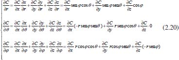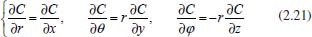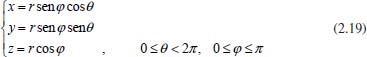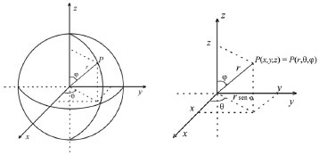 ![]() Figura 3. Visualização geométrica das coordenadas esféricas e sua relação com as coordenadas retangulares