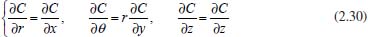 Análogo ao que foi feito na equação (2.13), pode-se escrever ![]() em que VΔS é o volume do pedaço da camada esférica, Ar é a área da parte da esfera de raio r, Ar+dr é a área da parte da esfera de raio r + dr, Jr é o fluxo passando por Ar e Jr+dr é o fluxo passando por Ar+dr. Como as dimensões dr, dθ e dφ são infinitesimais, pode-se tomar valores aproximados para o volume VΔS e para as áreas Ar e Ar+dr. Assim pode-se considerar: ![]() Logo, da equação tem-se ![]() Utilizando a expansão de Taylor17 até primeira ordem para Jr+dr tem-se ![]() Cancelando os termos semelhantes com sinais opostos e fazendo dr → 0 obtém-se: ![]() Utilizando a 1ª lei de Fick para o fluxo (lembrando que o gradiente é dado em termos de coordenadas esféricas) e considerando o coeficiente de difusão D constante, tem-se: ![]() Portanto, em termos de coordenadas esféricas, a equação de difusão radial é dada por ![]() conforme pretendia-se mostrar. Difusão cilíndrica Considerando hipoteticamente que a difusão ocorra através de um cilindro circular reto, de raio r, na direção radial, ou seja, do eixo central do cilindro para a sua superfície ou da superfície para o eixo central. Neste caso é conveniente utilizar coordenadas cilíndricas, cujas relações com as coordenadas cartesianas são dadas pelas equações: ![]() sendo sua interpretação geométrica mostrada na Figura 5: