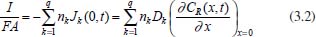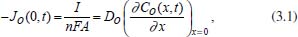 RESOLUÇÃO DA EQUAÇÃO DE DIFUSÃO Nesta seção serão apresentados alguns métodos matemáticos para a resolução da equação de difusão em coordenadas retangulares (difusão linear), esféricas e cilíndricas (difusão radial). Como visto na seção anterior, independentemente da geometria, a equação de difusão é sempre dada por uma equação diferencial parcial, envolvendo variáveis relacionadas ao tempo (t) e à posição da partícula em relação à superfície do eletrodo (x ou r). A sua resolução depende de pelo menos uma condição inicial relacionada à variável t, e pelo menos duas condições de contorno relacionadas à variável x ou à variável r. Estas condições dependem do fenômeno em estudo, da geometria do eletrodo e da técnica utilizada e, portanto, variam caso a caso. Leva-se em consideração, neste estudo, que não há reações químicas acopladas ao processo de transferência de carga e que as espécies O e R são solúveis e estáveis na solução. Coordenadas retangulares Considere um eletrodo plano de área A e um processo eletroquímico de oxidação ou redução, por exemplo, cujo fluxo das espécies se dá linearmente na direção perpendicular ao plano. De modo geral, a densidade de corrente j dada por I/A, sendo I a intensidade de corrente, relaciona-se com o fluxo da espécie oxidada O na superfície do eletrodo, JO (0,t), pela equação abaixo:10 ![]() sendo que ![]() e CO(x,t) e CR(x,t) representam, respectivamente, as concentrações das espécies O (oxidada) e R (reduzida) na posição x e no instante t, assim como JO e JR representam os fluxos destas espécies, DO e DR representam seus coeficientes de difusão, F é a constante de Faraday e q é o número de espécies que podem se reduzir. Em todos esses casos está sendo considerado que as espécies O e R não se solubilizam no eletrodo. As condições iniciais normalmente são determinadas pelo estado do sistema no início do processo, ou seja, em t = 0, enquanto que as de contorno levam em conta o que ocorre muito próximo da superfície do eletrodo (x → 0) ou distante dela, além da camada de difusão (x → ∞). Assim, em geral, tem-se: