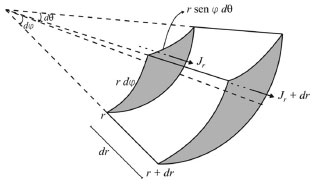 Neste caso, o gradiente de concentração da espécie que está se difundindo é dado pelas derivadas parciais de C em relação às variáveis r, θ e φ. Utilizando a Regra da Cadeia17 para derivadas de funções de várias variáveis, tem-se: ![]() No caso da difusão ser simétrica na direção do raio r pode-se tomar, sem perda de generalidade, o raio coincidindo com a direção x, ou seja, θ=0 e φ = ![]() e o gradiente de concentração, em termos de coordenadas esféricas, dado por ![]() Considerando agora um fluxo de espécies em estado estacionário, do centro para a superfície de uma esfera de raio r, pode-se assumir que ao redor de um ponto ao longo do raio, ou seja, quando Δr → 0, Δθ → 0 e Δφ → 0, o fluxo se comporta segundo a 1ª lei de Fick, ou seja, é proporcional ao gradiente de concentração da espécie que se difunde. Isso é possível pelo fato da direção radial ser perpendicular ao plano tangente à esfera em cada ponto de interseção do raio com a superfície da esfera. Assim, em uma vizinhança suficientemente pequena deste ponto pode-se considerar o fluxo através do plano tangente à esfera (aproximação linear). Portanto, a ideia utilizada para a formulação teórica deste problema é análoga à utilizada no caso da difusão planar. Sejam dr, dθ e dφ variações infinitesimais no raio r e nos ângulos θ e φ, respectivamente. Com isso tem-se uma região de camada esférica tridimensional de espessura dr, formada entre a esfera de raio r e a esfera de raio r + dr, conforme mostra a Figura 4: