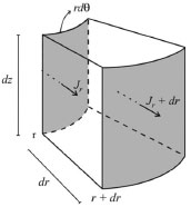 O gradiente de concentração da espécie que está se difundindo, dado pelas derivadas parciais de C em relação às variáveis r, θ e z, é, então, dado por: ![]() Análogo ao caso esférico, por existir simetria, pode-se considerar a difusão apenas na direção do raio r e, portanto, pode-se novamente tomar o raio coincidindo com a direção x, ou seja, θ = 0. Neste caso as derivadas parciais acima se tornam: ![]() e o gradiente de concentração, em termos de coordenadas cilíndricas, é dado por ![]() Tomando uma variação infinitesimal de tamanho dr no raio do cilindro, de dθ no ângulo e de dz na altura, tem-se uma região de camada cilíndrica tridimensional por onde o fluxo se difunde, conforme ilustrado na Figura 6: