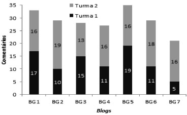 ![]() Figura 1. Gráfico da quantidade de mensagens de comentários publicadas por blog de grupo de alunos (representados pelas abreviações BG1 a BG7) das Turmas 1 e 2