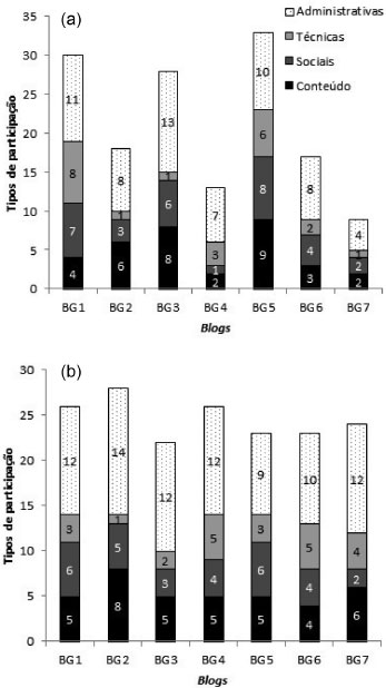 ![]() Figura 2. (a) Gráfico da quantidade dos tipos de participação encontrados nas mensagens de comentários publicadas por blog de grupo de alunos (representados pelas abreviações BG1 a BG7) da Turma 1. (b) Gráfico da quantidade dos tipos de participação encontradas nas mensagens de comentários publicadas por blog de grupo de alunos (representados pelas abreviações BG1 a BG7) da Turma 2.