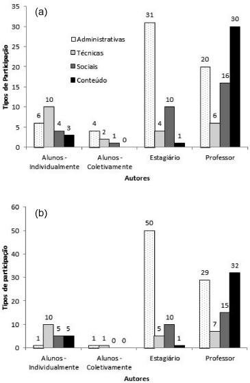 ![]() Figura 3. (a) Quantidade de tipos de participação em relação à autoria, nos blogs da Turma 1. (b) Quantidade de tipos de participação em relação à autoria, nos blogs da Turma 2