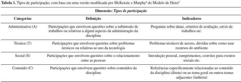 MODELO DE HENRI COMO REFERENCIAL DE ANÁLISE DOS COMENTÁRIOS Henri7 desenvolveu um modelo para análise de conteúdos de comunicações mediadas por computador. O autor sugere cinco dimensões para classificar mensagens eletrônicas: a taxa de participação (quantidade de mensagens); o tipo de interação (resposta direta ou comentário indireto); as pistas sociais (por exemplo, "Este é o meu aniversário, o que é um grande dia"); as competências cognitivas e habilidades metacognitivas. McKenzie e Murphy8 adaptaram o Modelo de Henri7 de modo a incluir informações adicionais em algumas dimensões. Segundo os autores, são quatro as categorias relacionadas aos tipos de participação passíveis de classificação nos conteúdos de comunicação mediada por computador: administrativa (A); técnica (T); social (S) e de conteúdo (C). A Tabela 1 apresenta a definição e os indicadores relacionados às categorias.