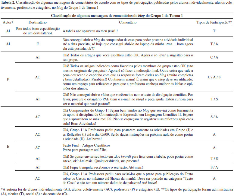 Para a análise dos comentários postados nos blogs, utilizamos a classificação das mensagens de comentários nas categorias dos tipos de participação apresentados na Tabela 1. Dessa forma, analisamos a natureza das mensagens publicadas nos comentários dos blogs, na perspectiva de verificarmos se estavam ou não relacionadas ao conteúdo da disciplina ou se eram mensagens de cunho social, técnico ou administrativo. Como forma de exemplificar a classificação das mensagens de comentários realizada neste trabalho, a Tabela 2 apresenta a classificação para algumas mensagens de comentários publicadas no blog do grupo 1 da Turma 1 pelos alunos individualmente (AI) e alunos coletivamente (AC), pela professora (P) e pelo estagiário (E). Cabe destacar que em algumas mensagens de comentários existiam sentenças que se enquadraram em tipos de participação diferentes e, portanto, alguns comentários foram classificados em mais de um tipo de participação.