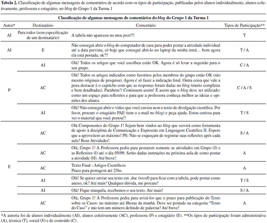 APLICAÇÃO DA PROPOSTA DE ENSINO Os blogs foram aplicados em duas turmas da disciplina de Comunicação e Expressão em Linguagem Científica II,4,9 ministrada no Curso de Bacharelado em Química do Instituto de Química de São Carlos, Universidade de São Paulo: Turma 1 (28 alunos) e Turma 2 (32 alunos). Além dos alunos, a professora e o estagiário também foram tomados como sujeitos da pesquisa. A referida disciplina possui carga horária de três créditos e não trata de conteúdos específicos de química, tendo entre os seus principais objetivos o desenvolvimento das habilidades de leitura e de comunicação dos alunos em linguagem científica,10 assim como o desenvolvimento da capacidade de busca nas diversas fontes de informação de interesse para os químicos. Durante o semestre letivo, os alunos trabalharam com artigos originais de pesquisa11,12 e com estudo de casos,13 sendo parte das suas atividades desenvolvidas nos blogs da disciplina. Assim, estes foram adaptados de forma a viabilizar a publicação das atividades extraclasse, de reflexões sobre o processo de ensino-aprendizagem e de comentários por parte da professora, do estagiário e dos alunos. Guias com instruções para realização das atividades e informações sobre os horários de monitoria também foram disponibilizadas. No primeiro dia de aula de ambas as turmas, a professora fez a apresentação do curso, na qual os alunos foram informados sobre o uso de blogs e sobre as estratégias de ensino que seriam utilizadas na disciplina. Ainda na primeira aula a professora formou, em cada turma, sete grupos de trabalho com três a cinco membros por grupo. Cada grupo recebeu o endereço e as senhas de acesso a um blog de grupo e o procedimento de postagem foi explicado. O blog constituiu-se em uma ferramenta integrada à disciplina, permitindo que fosse ampliada a abordagem dos conteúdos nela ministrados. O trabalho requisitado aos alunos com artigos originais de pesquisa, por exemplo, foi subsidiado por meio da inserção no blog de uma página denominada "Busca-Artigos". Esta página permitia o acesso a links de sites de busca e links de revistas eletrônicas de química e de áreas correlatas. Dessa forma, foi favorecida a ação de busca pelos artigos, sendo estes fundamentais no embasamento do conhecimento necessário para a realização de algumas atividades presenciais e online. Ademais, comentários que tratavam de características a eles referentes foram postados pelos alunos e esclarecidos pela professora no blog, evidenciando o valor da ferramenta ao possibilitar uma discussão mais ampla de questões pertinentes à disciplina. O trabalho requisitado aos alunos com os casos13 também foi apoiado por recursos disponibilizados no blog. De fato, este contava com uma aba denominada "Atividades (Casos)", na qual era possível a publicação de reflexões e comentários dos alunos sobre o andamento da resolução dos casos, assim como a busca por informações, instruções e suporte para a sua resolução. Tais possibilidades fomentaram a troca de conhecimentos entre os envolvidos no processo de ensino-aprendizagem sobre assuntos vinculados aos casos.13 No presente trabalho, somente os comentários são analisados. Cabe destacar que enquanto as atividades relacionadas à resolução de casos e à leitura e interpretação de artigos originais de pesquisa tinham notas atribuídas, a publicação de comentários não se constituía em tarefa obrigatória da disciplina, sendo realizada de forma espontânea pelos alunos. A análise de dados baseada na produção espontânea de comentários também é reportada por Den e Yuen,14 que consideram a liberdade de expressão e o compartilhamento informal como fatores positivos dessa espontaneidade.
