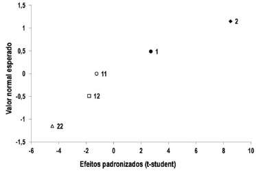 ![]() Figura 5. Gráfico de probabilidade normal para a massa de catalisador (g) e volume de metanol (mL) na primeira parte da reação