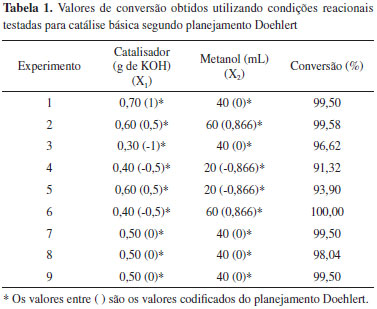 RESULTADOS E DISCUSSÃO Ressonância magnética nuclear de hidrogênio Utilizando a Equação 1, para o cálculo da conversão do óleo de soja em ésteres metílicos, tem-se como exemplo, para o experimento número 1, o seguinte resultado: ![]() Para os demais experimentos as conversões foram calculadas da mesma forma, gerando os dados apresentados nas Tabelas 1 e 2, com as variáveis estudadas na catálise básica e na catálise ácida, respectivamente.
