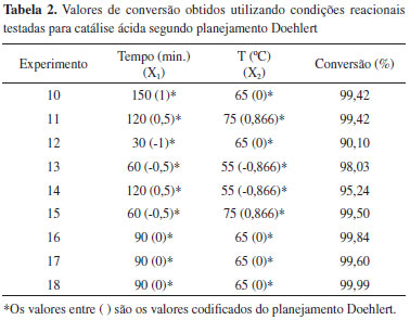 Análise da conversão para catálise básica segundo planejamento Doehlert Segundo artigo de Samios et al. para a catálise básica, a quantidade estequiométrica ideal dos reagentes é de 0,10 mols de óleo: 1 mol de álcool: 0,001 mols de catalisador, aproximadamente, ou seja, para 100 mL de óleo utilizados, deveriam ser adicionados 40 mL de metanol e 0,5 g de catalisador,8 que foram as condições utilizadas para o ponto central do planejamento. Analisando os dados da Tabela 1, iniciando pelos experimentos 7, 8 e 9, referentes ao ponto central do planejamento Doehlert, foram obtidos, em média, valores de conversão em torno de 99%. Partindo do ponto central, no qual foi utilizado 40 mL de metanol, pode-se observar também os experimentos 1 e 3, que utilizaram a mesma quantidade de metanol porém variando a quantidade de catalisador que foi diminuída para 0,30 no experimento 3 e foi aumentada para 0,70 no experimento 1. Esta variação resultou em valores de conversão maiores quando a quantidade de catalisador foi aumentada e em conversões menores quando a quantidade de catalisador foi diminuída, mostrando a sua influência na conversão. Quando o volume de metanol foi fixado em 60 mL, que é o volume máximo testado, nos experimentos 2 e 6, a conversão aumentou para 100% (maior valor obtido entre todos os experimentos) quando a massa de catalisador utilizada foi de 0,40 g e permanece praticamente igual à conversão do ponto central quando a massa de catalisador é de 0,60 g, o que também mostra a maior relevância da quantidade de metanol em relação à quantidade de catalisador. Da mesma forma, quando foi diminuído o volume de metanol para 20 mL, independentemente da quantidade de catalisador utilizada, o percentual de conversão da reação de transesterificação diminuiu consideravelmente. Além disso, nota-se também que quando se soma a redução do valor da outra variável, isto também contribui para a diminuição da conversão como é observado no experimento 4. Quando analisamos do ponto de vista da mesma quantidade de catalisador, nos experimentos 4 e 6, confirmamos que o volume de metanol é primordial para uma boa conversão da reação. Assim como no experimento 3, em que é diminuída ainda mais a quantidade de catalisador, a quantidade de metanol aumenta, o que aumenta também a conversão. Já analisando os experimentos 2 e 5, que utilizam maiores quantidades de catalisador, verificamos também que a conversão é muito maior quando o volume de metanol utilizado também é alto. Além disso, quando a quantidade de catalisador é a maior, como no experimento 1, porém se diminui a de metanol, como acontece no restante dos experimentos, a conversão é boa. As observações anteriores comprovam que o metanol, como é um reagente que participa da reação de transesterificação, é fundamental para a produção de biodiesel, e que a sua quantidade mínima ideal, para 100 mL de óleo, é de 60 mL para obtenção de uma conversão ótima de 100%. Já a quantidade mínima de catalisador para 100 mL de óleo é de 0,40 g. Análise da conversão para catálise ácida segundo planejamento Doehlert Segundo artigo de Samios et al. para a catálise ácida, a temperatura ideal de reação, que é a temperatura de refluxo do solvente (metanol), é de aproximadamente 65 ºC e o tempo de reação necessário é de 90 minutos.8 Analisando os dados da Tabela 2, os experimentos 16, 17 e 18 são referentes às condições determinadas para o ponto central do planejamento experimental Doehlert, ou seja, tempo de uma hora e meia e temperatura de 65 ºC. Nessas condições, foram obtidos ótimos valores de conversão, em média, de 99,8%, mostrando que a combinação desta temperatura e tempo de reação para a catálise ácida é suficiente para a obtenção de biodiesel. Além disso, foram estudados outros tempos de reação enquanto se manteve constante a temperatura em 65 ºC. Nessas condições, nos experimentos 10 e 12, foi observado que quando o tempo foi reduzido 3 vezes houve uma queda na conversão e quando o tempo foi aumentado consideravelmente não houve grande melhora na conversão. Quando a temperatura de reação foi reduzida em 10 ºC, ou seja, passou para 55 ºC, nos experimentos 13 e 14, foram estudadas tempos de reação de uma e duas horas. Foi observado que com o aumento do tempo de reação houve diminuição na conversão. Por fim, foi avaliada a condição de temperatura fixada em 75 ºC, 10 ºC a mais que o ponto central, com tempos de reação de uma e duas horas, nos experimentos 11 e 15. Nestes casos, independentemente do tempo de reação, obtiveram-se valores de conversão muito próximos. Quando se observa os dados a partir da variação da temperatura, fixando o tempo para fins de comparação, como nos experimentos 13 e 15, em que o tempo de reação é de uma hora e a temperatura foi aumentada de 55 para 75 ºC, verificou-se um aumento pequeno na conversão. Já para o caso dos experimentos 11 e 14, nos quais o tempo foi fixado em duas horas e a temperatura foi aumentada de 55 para 75 ºC, observou-se também uma redução do valor de conversão obtido. Conclui-se que, em geral, para os experimentos de variação de temperatura e tempo de reação da catálise ácida, há um efeito sobre o equilíbrio dessa reação, no qual o aumento de uma das variáveis avaliadas, combinado com a redução da outra, resultam em melhores valores de conversão. Tempos e temperaturas de reação muito altos não favorecem necessariamente a reação, deslocando o equilíbrio da reação no sentido dos reagentes, como no caso do experimento 11. Assim, se necessitamos, por exemplo, a otimização do estudo para tempos menores, devemos utilizar uma temperatura mais elevada de reação. De maneira geral, uma boa condição é a que foi utilizada no ponto central, com temperatura de 65 ºC e tempo de 90 minutos, obtendo valores satisfatórios de conversão. Além d