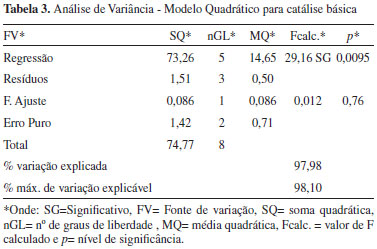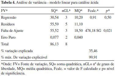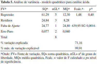 sendo Y1 é a conversão, X1 é a massa de catalisador e X2 é o volume de metanol. Como pode ser visto na Tabela 3 o modelo quadrático proposto para a catálise básica apresenta uma regressão significativa e uma falta de ajuste não significativa. Desta forma, observa-se ainda que a maior parte da variação é descrita pela equação de regressão e o restante pelos resíduos. Da variação contida nos resíduos, a maior parte é devido ao erro puro que é relativo ao erro experimental e o restante é descrito pela falta de ajuste que está diretamente relacionada com o modelo. Como pode ser visto nas Tabelas 4 e 5, tanto o modelo linear quanto o quadrático propostos para a catálise ácida apresentaram falta de ajuste significativa.