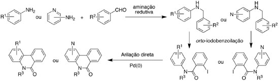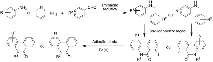 RESULTADOS E DISCUSSÃO Inicialmente foram preparados derivados de N-benzilaminas secundárias através da reação de aminação redutiva. Em seguida as aminas secundárias foram transformadas em amidas terciárias por uma reação de benzoilação e finalmente as amidas terciárias foram aplicadas na reação de arilação direta para obter os derivados de fenantridinonas (Esquema 1).74