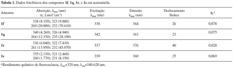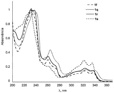 ![]() Figura 6. Espectros de absorçao normalizado de 1f, 1q, 1r e 1s em acetonitrila (A300nm = 0,1)