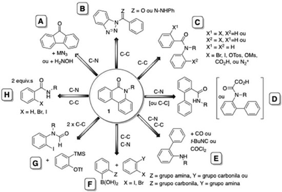 Os métodos clássicos para a preparação de 1 incluem: a reação de Schmidt12 (utilizando o ácido difênico),13 ou o rearranjo de Beckmann14 de derivados de fluorenonas (Figura 2, A) e o rearranjo de Hoffmann da monoamida de ácido difênico.15 Outros métodos empregam derivados de bifenila substituídos na posição 2, por exemplo a reação de Pictet-Hubert16 e a sua modificação de Morgan-Walls,17 aplicada à síntese de fenantridinas seguida por oxidação,18 ou a ciclização do etil carbamato de 2-aminobifenila,19 e a reação de 2-aminobifenila com fosgênio (Figura 2, E),20 ou a sequência de reações envolvendo a nitração, redução e desidratação aplicada ao ácido bifenil-2-carboxílico,21 e a oxidação de bifenil-2-carboxamidas (Figura 2, D).22 Além destes métodos, as fenantridinonas (1) podem ser obtidas pelo rearranjo térmico de 2-alcoxifenantridinas23 ou cicloadições de Diels-Alder,24 ou, fotoquimicamente, por irradiação de aril-hidrazonas de benzotriazol (Figura 2, B),25 ou por foto-desidro-halogenação de benzoilanilinas (Figura 2, C),26-28 foto-ciclo-adição de estirenos com isoquinolinonas,29 ou por pirólise de derivados de 3-arilidenoamino-1,2,3-benzotriazin-4-onas30 e de benzoilbenzotriazóis (Figura 2, B).31 Outros métodos envolvendo intermediários radicalares incluem a reação de Pschorr32 e ciclizações promovidas por reagentes como Bu3SnH,33 SmI2/HMPA34 ou TTMSS35 na presença de oxigênio (Figura 2, C). O mecanismo destas reações radicalares passa por um intermediário, um espirocicloexadieniloxindol, que pode, ou não, sofrer um rearranjo para gerar 1 dependendo das condições reacionais.36 A eliminação do uso de metais pesados e metais de transição pode ser importante dependendo da finalidade de uso dos produtos. Desta forma, a oxidação de ácidos de biaril-2-oxâmicos utilizando persulfato de sódio em DMSO (Figura 2, D)37 e a descoberta recente de que o t-BuOK na presença de diaminas pode promover a ciclização radicalar de N-2-halobenzoilanilinas38,39 ou de N-benzoil-2-haloanilinas40 (Figura 2, C) representam métodos inovadores para a síntese de 1. Por outro lado, metodologias que reduzem o grau de pre-funcionalização de substratos, como por exemplo a ciclização oxidativa de 2-fenilbenzamidas catalisada por CuI na presença de oxigênio e t-BuOK,41 são uma abordagem potencialmente mais eficiente (Figura 2, C). O uso de sais de cobre para obter derivados de 1 tem se limitado ao homoacoplamento oxidativo de reagentes de Grignard,42 a reação de Goldberg intramolecular de 2-ciano-2'-halobiarilas sob condições de hidrólise básica,43 e a reação de acoplamento cruzado, co-catalisada com Pd(0), de 2-nitrobromobenzeno com derivados de 1-bromobenzoato de metila.44 Porém, de forma mais abrangente, a investigação de métodos com catálise por sais de paládio levou ao desenvolvimento de novas metodologias e abordagens para a síntese de derivados de 1. Os pesquisadores Ames e Opalko foram os primeiros a relatar a síntese de 1 por reações de desidro-halogenação de 2-halobenzoilanilinas ou de benzoil-2-haloanilinas catalisadas por paládio (Figura 2, C).45 A abordagem utilizada é atualmente conhecida como um método de arilação direta46 (intramolecular) e é um método bastante empregado para a síntese de derivados de fenantridinonas. Os métodos de arilação direta catalisada por sais de paládio aplicados à síntese de 1 tipicamente envolvem a reação de um haloareno (bromo e iodo derivados são os mais utilizados) para formar um intermediário organopaládio via adição oxidativa de Pd(0). Este intermediário participa na funcionalização de uma ligação C-H de um segundo grupo areno para formar uma ligação biarila de forma intramolecular.47,48 Tanto derivados de N-2-halobenzoil-N-alquilanilinas quanto derivados de N-benzoil-N-alquil-2-haloanilinas podem ser empregados em reações catalisadas por diversas fontes de Pd(0) na presença ou ausência de ligantes como fosfinas.49-51 O halogênio do substrato pode ser substituído por um sal de diazônio,52 triflato,53 tosilato ou mesilato (Figura 2, C).54 Os exemplos de arilação direta envolvem a funcionalização de uma ligação C-H. Outras estratégias envolvem a funcionalização de duas ligações C-H ou uma combinação de ligações C-H e N-H. Um dos primeiros exemplos da funcionalização de duas ligações C-H aromáticas para a síntese de 1 foi a oxidação de benzanilida utilizando Pd(O2CCF3)2/Sn(OAc)2/O2 em AcOH (Figura 2, C).55 Mais recentemente, sais de Pd(II) na presença de persulfato de sódio,56 ou ácido benzóico em uma atmosfera de oxigênio,57 ou AgOAc in PivOH/AcOH foram utilizados para promover o acoplamento oxidativo para obter 1 (Figura 2, C e D).58 Exemplos da síntese de 1 por reações envolvendo a funcionalização de ligações C-H e N-H em sistemas biarilas incluem a carbonilação de biarilaminas catalisada por Pd(II),59,60 ou a carbonilação redutiva de 2-nitrobiarila catalisada por Ru3(CO)12,61 e a utilização de isocianeto de t-butila,62 ou de forma indireta via a carbonilação de derivados de 10,9-borazarofenantrenos catalizado por Pd(OAc)2 (Figura 2, E).63 Além dos métodos envolvendo reações de acoplamento intramolecular, ou que partem de sistemas biarilas funcionalizados, diversos métodos envolvendo reações de acoplamento cruzado intermoleculares tem sido descritos. A reação de Suzuki-Miyaura aplicada à síntese de derivados de 1 mostra a versatilidade desta metodologia para o acoplamento de substratos altamente funcionalizados, apesar da necessidade de utilizar dois reagentes pré-funcionalizados para a síntese da ligação biarila (Figura 2, F).64 Ácidos benzóicos podem substituir ácidos fenil borônicos em reações de acoplamento cruzado,65 e um exemplo aplicado à síntese de 1 envolveu o aquecimento do ácido N-2-bromobenzoil-N-metilantranílico em NMP na presença de Pd(OAc)2.66 Uma abor