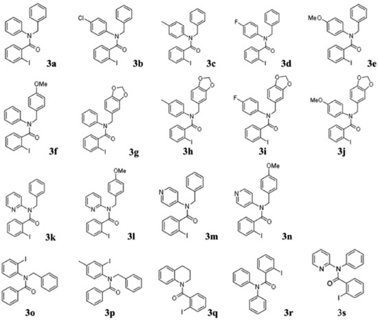 Reações de benzoilação As aminas secundárias (Figura 3) foram empregadas em reações de benzoilação para obter as amidas terciárias (Esquema 1). Os substratos foram acilados utilizando cloreto de orto-iodobenzoíla (produtos 3a-n, q-s) ou cloreto de benzoíla (produtos 3o e 3p). As estruturas das amidas terciárias (3) estão ilustradas na Figura 4.