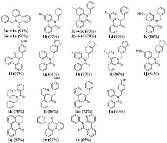 No caso das reações de (orto-iodo)benzoilação, uma solução do cloreto de ácido em CH2Cl2 foi acrescentada lentamente a uma solução da amina secundária em solução de CH2Cl2/Et3N resfriada em banho de gelo. A reação foi relativamente rápida (~2 h). Porém, no caso dos sistemas piridínicos (2k - n), onde o nitrogênio secundário é menos básico, foi necessário utilizar uma base mais forte para promover a abstração do próton. A base utilizada foi uma mistura de Et3N e 10 mol% DMAP. A reação prosseguiu de forma mais lenta, levando aproximadamente 4 h. Os procedimentos experimentais são detalhadas no Material Suplementar. As estruturas das Figuras 3 e 4 foram caracterizadas espectroscópicamente e os dados podem ser consultados no Material Suplementar. Geralmente, os compostos N-orto-iodobenzoil-N-benzilfenilaminas apresentam sinais de RMN característicos: CH2 benzílico (~5,0 ppm); simpletos referente a presença de MeO (~3,8 ppm) ou metila (~2,0 ppm) com integração relativa equivalente a três hidrogênios ou um simpleto referente a dois hidrogênios no caso da presença de um grupo metilenodioxi (~5,8 ppm). Os metilenos do anel tetraidroquinolínico (3q) aparecem na faixa 3,0-4,5 ppm). Os derivados piridínicos (3k-m) apresentam os respectivos sinais dos hidrogênios do anel piridínico mais desblindados, tipicamente na faixa de 8,0 - 8,5 ppm, devido à maior acidez dos hidrogênios. A caracterização dos compostos por RMN de 13C mostrou, além do número de sinais esperados para cada composto, alguns sinais bastante semelhantes entre os compostos: as ligações C-I (~90ppm), C=O (~170 ppm), e o sinal CH2 benzílico (~52 ppm). Nos compostos contendo o grupo metilenodioxi, o sinal de RMN de 13C tem um deslocamento bem característico em ~100 ppm enquanto os grupos metoxi ou metila aparecem em torno de 55 e 21 ppm respectivamente. No caso das estruturas benzoiladas (3o e 3p) os sinais de 13C das ligações C-I aparecem em torno de 80 ppm. Além disso, os espectros de RMN de 13C das estruturas benzoiladas apresentam um par de sinais com intensidades bastante superiores aos outros sinais devido à presença de dois pares de carbonos equivalentes (carbonos 2 e 6, e 3 e 5) no anel aromático do grupo benzoíla. Síntese de fenantridinonas via a reação de arilação direta As reações de arilação direta tiveram como objetivo a funcionalização da ligação Csp2-H catalisada por paládio para formar a ligação biarila das fenantridinonas. A metodologia empregada48,51 para a reação de arilaçao direta consistiu no aquecimento (110 ºC sob agitação) do substrato iodado (3, 1 mmol) na presença de KOAc (5 mmol), TBAB (1 mmol), e uma quantidade catalítica de Pd(OAc)2 (10 mol%) em DMF durante 24 h. Os produtos das reações foram isolados por partição da mistura reacional entre água e um solvente orgânico (CH2Cl2). A fase orgânica foi seca com Na2SO4 anidro, a solução foi filtrada, e após a evaporação sob pressão reduzida o produto bruto foi purificado em coluna cromatográfica com sílica gel. A purificação dos produtos foi facilitada pela observação da fluorescência dos produtos, tanto no comprimento de onda longo (365 nm) quanto no comprimento de onda curto (254 nm) da lâmpada UV de revelação. A Figura 5 mostra as estruturas dos produtos das reações de arilação direta intramolecular e os respectivos rendimentos. No caso da síntese dos produtos 1a e 1c, cada produto foi obtido a partir de dois substratos diferentes mostrando uma versatilidade da metodologia: 1) utilizando os substratos orto-iodobenzoíla (3a e 3c), e 2) utilizando os substratos N-benzoil-orto-iodoanilinas (3o e 3p).