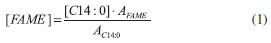 where, [FAME] is the concentration of each FAME, [C14:0] is the concentration of the internal standard fixed at 2.0 g L-1, AFAME and AC14:0 are the FAME and internal standard areas, respectively, which were obtained by the integration of the corresponding peaks in the chromatogram. From the results shown in Table 1 and using the results obtained in Figure 5, it was possible to verify whether the reactions were successful or not by comparing the found FAMEs with the fatty acid content of each raw material, as established from previously published reports.16
