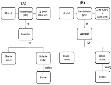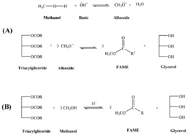 ![]() Figure 2. Biodiesel preparation. (A) by basic catalysis and (B) by acidic catalysis