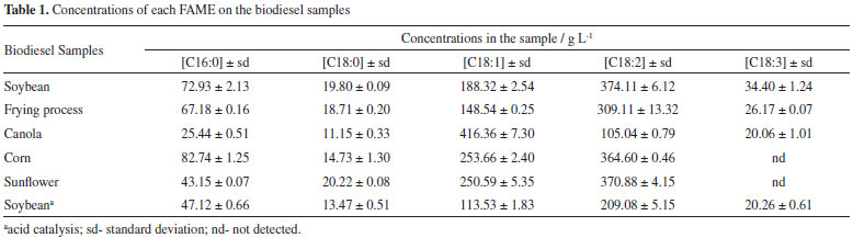 Thus, in the samples obtained from basic transesterification, it could be observed that the FAMEs concentrations were in the expected range, except for the biodiesel made from acidic transesterification, indicating that this reaction was not advantageous, and for biodiesel from frying processes, which, despite presenting considerable FAMEs concentrations, had a large percentage of non-transesterified matter or non-detectable FAMEs. On the other hand, the samples that were transesterified by basic catalysis resulted in good yields and expected concentration ranges, except for the sample made from oils used in frying processes, indicating that, before the transesterification reaction, a pre-treatment process is required through an esterification process. The biodiesel made from soybean, obtained by acidic catalysis, did not present good results, indicating that the reaction conditions must be optimised.