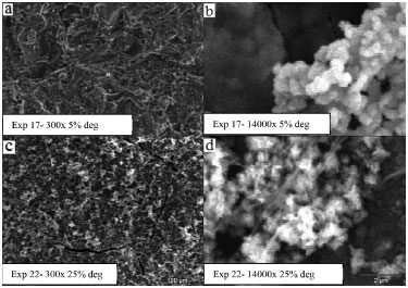 Glass plates results Despite being the most widely used substrate for catalyst immobilization, mainly because of its availability and low cost, glass did not present good results immobilizing ZnO, using the technique adopted here. Data analysis by ANOVA shows that none of the variables were significant and that the model does not fit the experimental data. Despite the low correlation with the model, the results indicated a tendency to obtain a good response in certain synthesis conditions. The experimental conditions that allowed the highest photocatalytic degradation of rhodamine were those of Experiment 5 with a dye removal of 30%. Overall, when comparing all the substrates, the glass plates present the smallest quantity of solid on the surface. The images shown in Figure 1 compare the ZnO microstructures on the glass substrate under different experimental conditions.