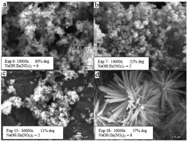 For the copper plate substrate, better ordination of the structures provides higher dye degradation. Experiments 8 and 18, figures 5b and 5d respectively, presented an ordered array, while experiment 1, figure 5a, presented poor ordination and low dye degradation. XRD characterization To better understand the samples' composition, the phase purity and crystallographic structure of the white powder deposited at the bottom of the autoclaves after the hydrothermal reaction were determined by XRD analysis. All peaks can be indexed to hexagonal wurtzite-structured ZnO, consistent with the standard data (JCPDS Card No. 65-3411). Some of the results of the experimental design of zinc plate substrates are shown in Figure 6.